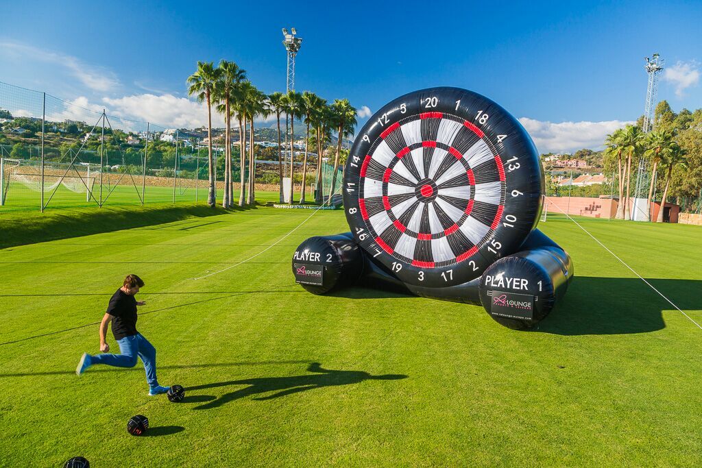 Footdarts Marbella is a completely mobil, inflatable, over sized, velco-covered "dartboard". The game consists of a competition with few or many people kicking velco covered balls on to the "dartboard" with accuracy and aim. It is hilarious, and it is a great team building or party activity. It improves your goal keeping and shooting abilities and it is fun for everyone.
