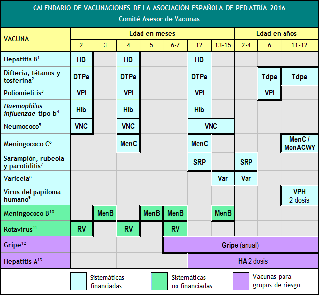 Vaccinations for kids in Spain are recommended by the Spanish association of paediatricians for the health of your children. Below you find the schedule vaccinations for the year of 2016 and in blue the vaccines which are covered by the Spanish health insurance; Seguridad de Salud Sanitaria.