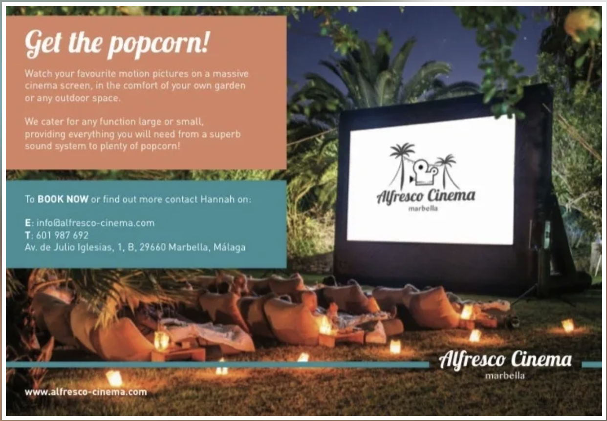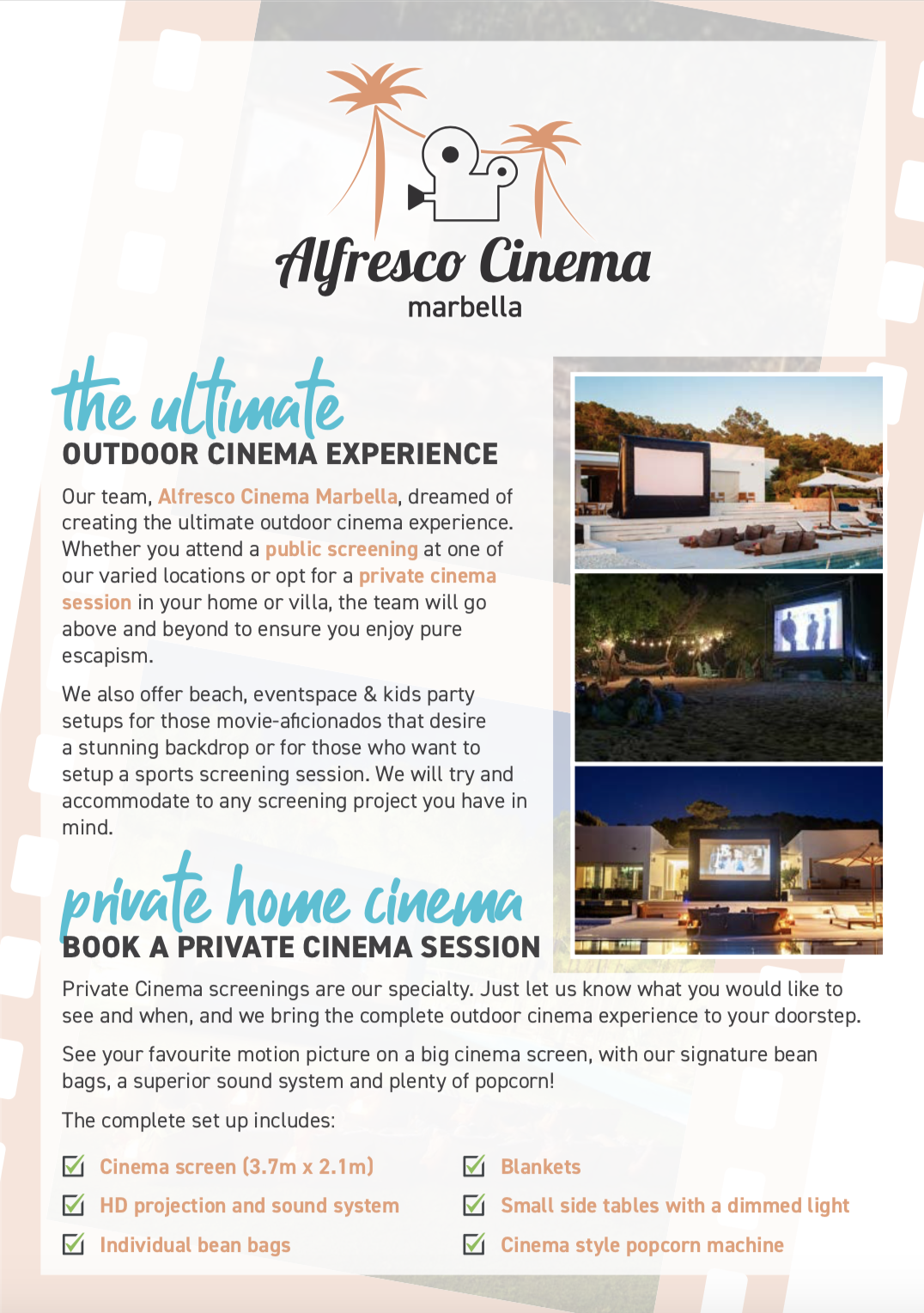 Contact Alfresco Cinema Marbella at their details below to read some reviews and find out more about what they can offer for your private family movie night.