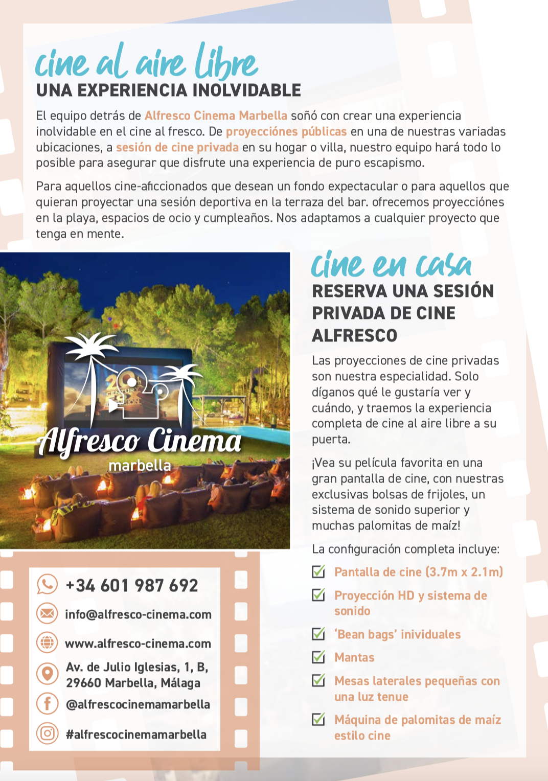 Alfresco Cinema is a new cinema concept in Marbella, allowing you to have your very own XL screen set up in your garden or any outdoor area. It is the perfect event for small or large groups, and the company truly provides everything necessary for a movie night under the stars.