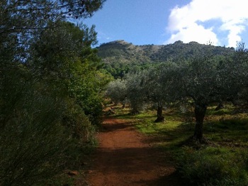 The first part of the walk took us up a wide track flanked by pretty olive trees and then into a shaded pine forest which gently zig-zagged upwards. After a brief water break we began a more demanding climb with with some loose stones and narrow paths until we reached the base of La Cruce, the smaller peak, we were again out in the open, this part had taken us about 1 hour.