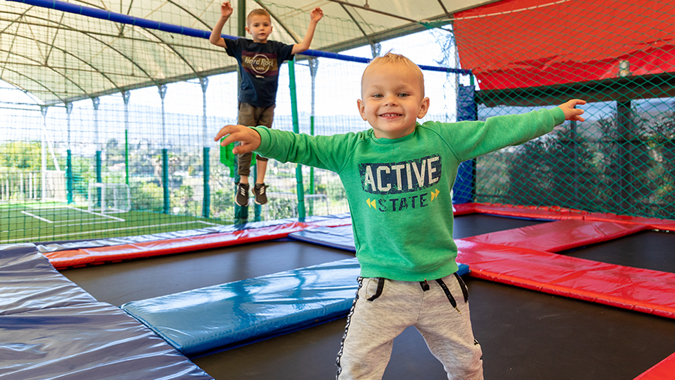 Main playframe for 4 to 12 year olds: Let your little monkeys go wild in their huge play-frame with triple slide, twister slide, double slide, volcano, sports field, power tower, giant ball pool, smaller ball pool, ramps, trampoline and climbing wall. They will also be holding regular events with other kids attractions so there will always be something new to entertain them.