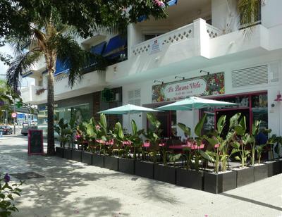 La Buena Vida (the good life) is on the corner of the central roundabout in San Pedro and Avda. Del Mediterraneo No.5. street parking or underground in avda Marques del Duero (the other side of the roundabout) closed on a Monday. They open from 9:00 am till late. Average snaky meal under 20€ average dinner 30€