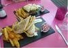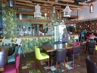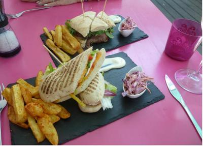 Stylishly furnished, decorated and lit, it seats 40 inside and a further 28 on deck outside. The sensibly designed menu is divided into breakfast (that they will serve up to 5 o/c) sandwiches, salads, panini’s, dishes to share, main course, (that they start serving after 5 o/c) desserts, tea and coffee and all manner of booze. The evening meals are prepared by Chilien chef Gaston, but Abdul is responsible for the lunch that we will eat. We chose a Steak Sandwich and a Chicken & Sweet Chilly Panini with Coleslaw, both dishes accompanied by French fry’s, and because the rotating dessert cabinet was displaying its temptations so well, we succumbed to a New York Cheese Cake and a Carrot Cake (that’s my excuse anyway). Anna and Felix our waiters were informative and attentive.
