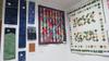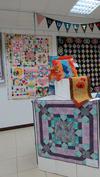 Hanging from the ceiling are two banners made in different ways. One is like bunting. Triangles have been made with the letters of Quilters del Sol using a method call piecing and strung together to spell out the name of the group. The other has the letters of the name made from small squares sewn together. These have then been sewn onto the background. Both the banners are very good.