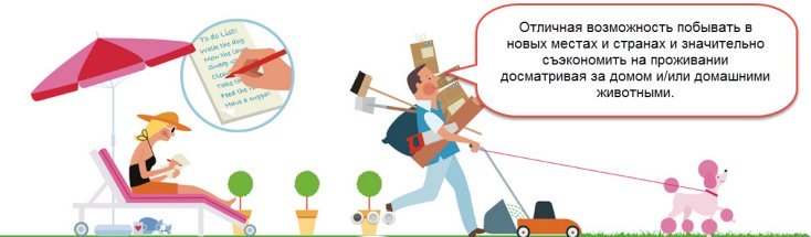 Если Вы любите домашних животных, то Вы будете просто незаменимы, так как большое количество владельцев домов ищут людей, которые смогут присмотреть за их домашними любимцами и пожить в их доме, в то время, как они будут временно в отъезде. Вам необходимо знать Английский язык для использования данного ресурса. Нажмите на баннер, расположенный ниже для получения более подробной информации.