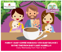 Каждую Среду с 11:00 и до 13:00. Для детей возрастом от 1 до 3-х лет. Вход 5€ включает бесплатное кофе, доступ в мягкую интерактивную игровую зону для малышей и участие в занятиях «Прыжки и Рифмы».